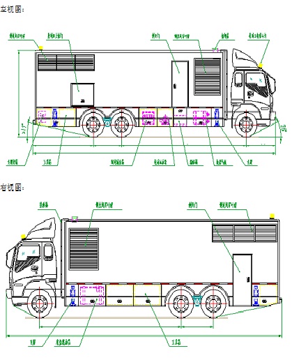 1.2、整車總體布局:箱體與車頭為整體式結(jié)構(gòu),采用箱式貨車改制,箱體采用鋼骨架及蒙皮、內(nèi)部填充消音吸聲材料,箱體分成三個獨立區(qū)域,即排風降噪聲區(qū)、機組設(shè)備工作區(qū)、后艙輔助設(shè)備區(qū)(進氣消聲、電纜線放置區(qū))。機組設(shè)備工作區(qū)內(nèi)設(shè)置有康明斯柴油發(fā)電機組、進風消音風道、防爆照明燈、快速輸出插座等。后艙輔助設(shè)備區(qū)內(nèi)設(shè)備有動力輸出線纜、進氣消音、等裝置。